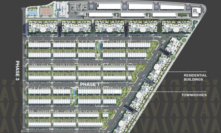 - يتألف الكمبوند من 9 مباني، كل مبنى على ارتفاع بدروم+ طابق أرضي+ 6 طوابق متكررة+ رووف.